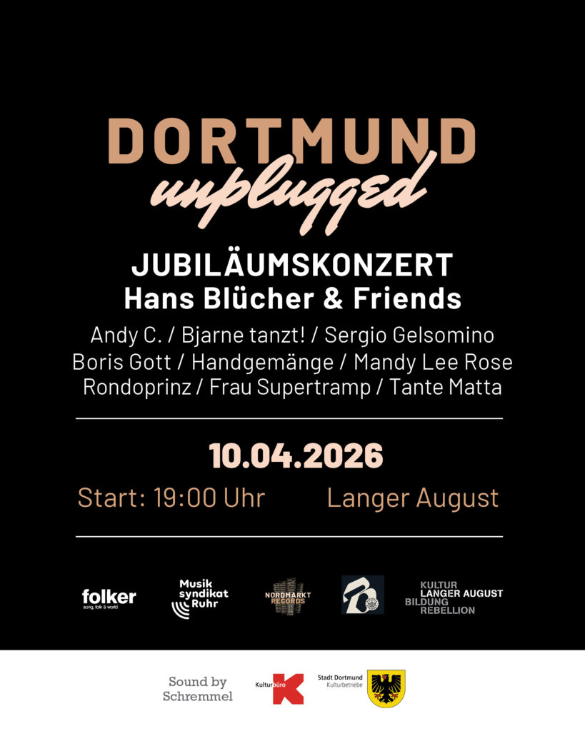 Die Schiller Songwriter Stage „Dortmund Unplugged“ ist eine Konzertreihe im Langen August, bei der lokale Künstler*innen im Mittelpunkt stehen. An jedem zweiten Freitag im Monat präsentieren drei Acts ein jeweils 30-minütiges Programm mit akustischen Instrumenten, eigenen Songs und großer Nähe zum Publikum. „Dortmund Unplugged“ fördert die Vielfalt und Kreativität der Dortmunder Singer/Songwriter Szene. Es schafft eine Plattform für lokale Talente, um sich zu präsentieren und eine enge Bindung zwischen Künstlern*innen und Zuhörer*innen aufzubauen. Moderiert wird die Reihe von Hans Blücher und einem Team von Nordmarkt Records und dem Musiksyndikat Ruhr.